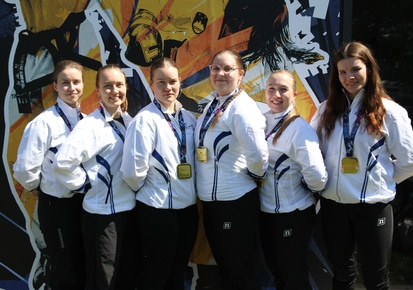 Kuva: Laura Nikkola-Kuusisto / SITF. Kuvassa naisten voimamurskausjoukkue kultamitaleineen: Nelli Kiikkinen (vas.), Heta Nieminen, Veera Kilpala, Karoliina Kivioja, Lotta Keränen ja Hertta Nieminen.